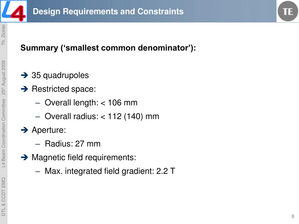 Design Requirements and Constraints CCDTL specific requirements: • 14 + 7 quadrupoles • Restricted space: • in particular intertank • Overall length: < 198 mm (?) • Overall radius: < 112 (140) mm • Aperture: • Radius: 20 mm • Magnetic field requirements: • Max. integrated field gradient: 1.8 T No CCDTL prototype drawing available