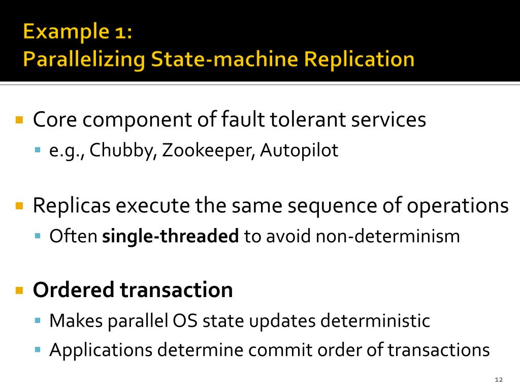 Example 1: Parallelizing State-machine Replication • Core component of fault tolerant services • e.g., Chubby, Zookeeper, Autopilot • Replicas execute the same sequence of operations • Often single-threaded to avoid non-determinism • Ordered transaction • Makes parallel OS state updates deterministic • Applications determine commit order of transactions