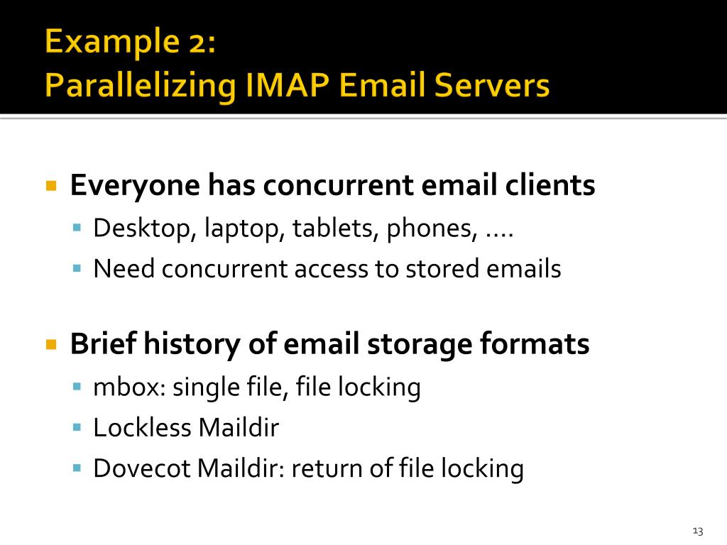 Example 2: Parallelizing IMAP Email Servers • Everyone has concurrent email clients • Desktop, laptop, tablets, phones, .... • Need concurrent access to stored emails • Brief history of email storage formats • mbox: single file, file locking • Lockless Maildir • Dovecot Maildir: return of file locking