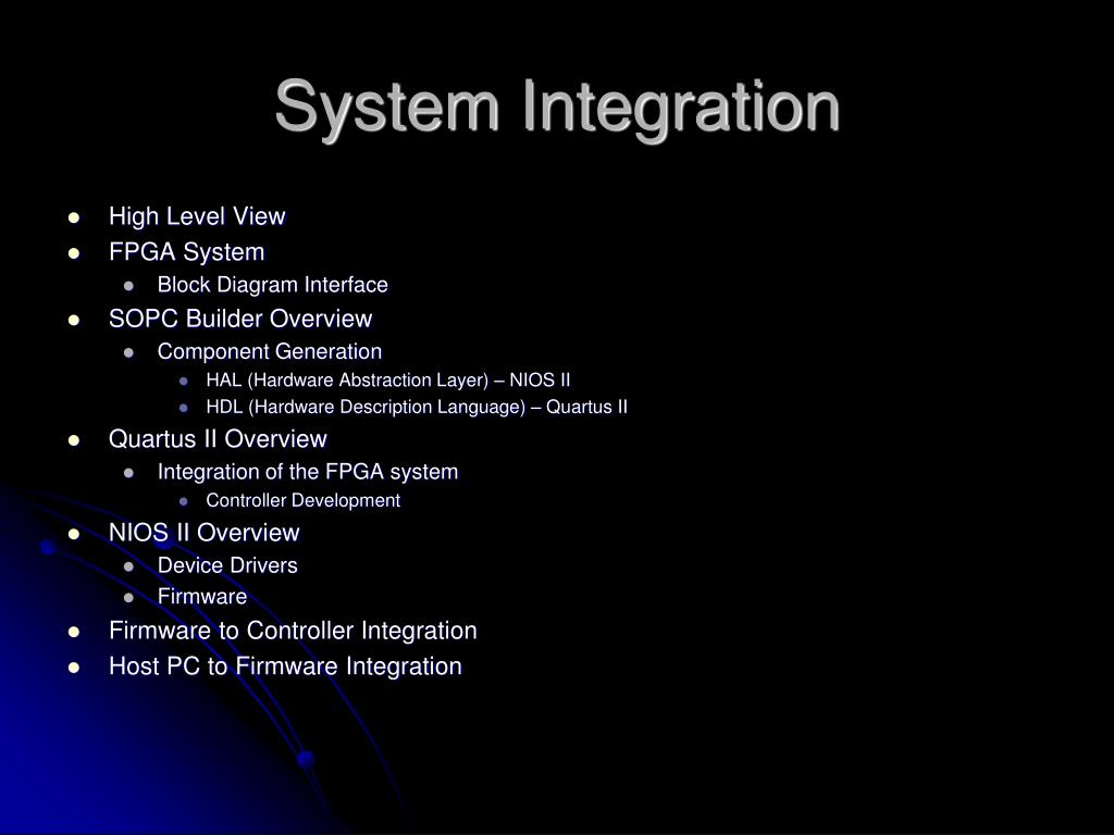 System Integration • High Level View • FPGA System • Block Diagram Interface • SOPC Builder Overview • Component Generation • HAL (Hardware Abstraction Layer) – NIOS II • HDL (Hardware Description Language) – Quartus II • Quartus II Overview • Integration of the FPGA system • Controller Development • NIOS II Overview • Device Drivers • Firmware • Firmware to Controller Integration • Host PC to Firmware Integration