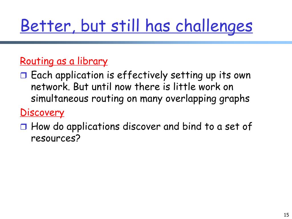 Better, but still has challenges Routing as a library • Each application is effectively setting up its own network. But until now there is little work on simultaneous routing on many overlapping graphs Discovery • How do applications discover and bind to a set of resources?