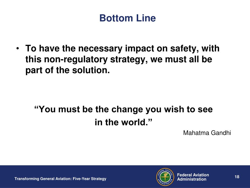 Bottom Line • To have the necessary impact on safety, with this non-regulatory strategy, we must all be part of the solution. “You must be the change you wish to see in the world.” Mahatma Gandhi
