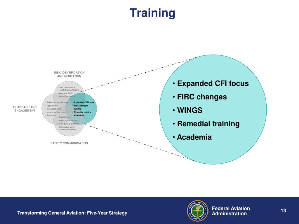 Training • Expanded CFI Focus • Senior CFI Forum • FIRC updates • Review CFI recurrent training and renewal requirements • Gather input from GA community • WINGS pilot proficiency: www.faasafety.gov • Re-emphasis on remedial training – pilots and mechanics