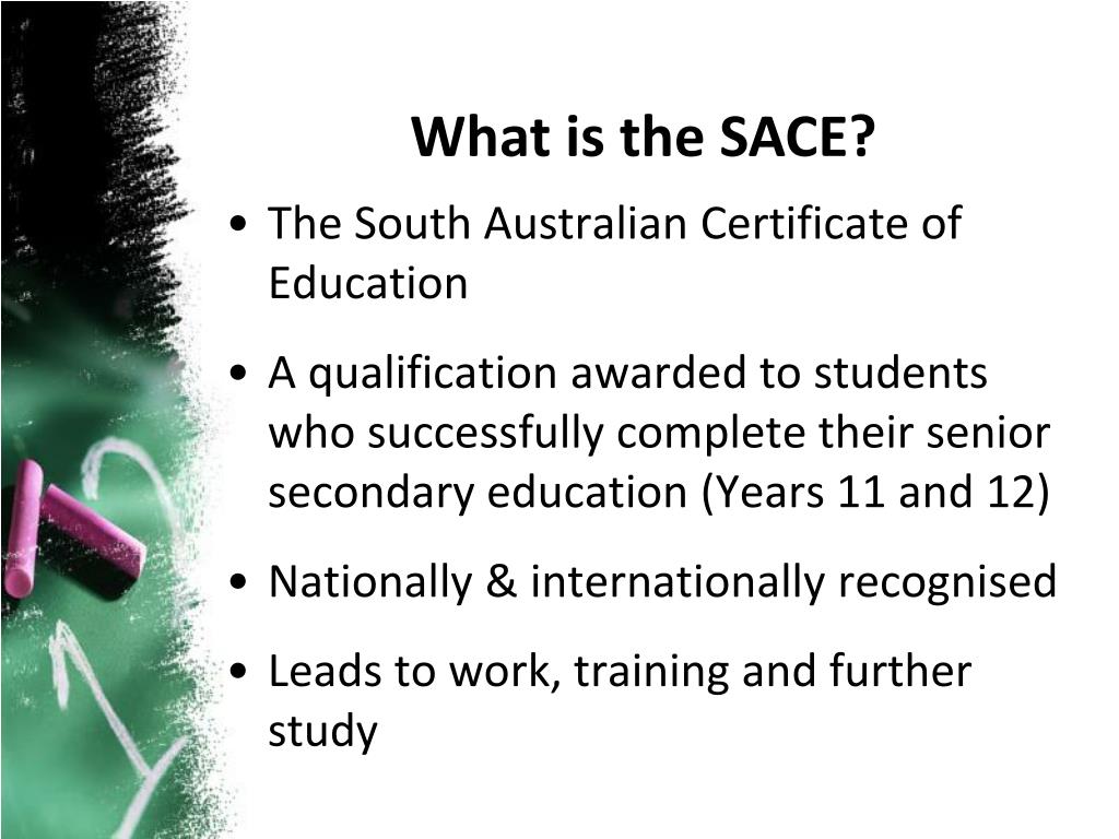 What is the SACE? • The South Australian Certificate of Education • A qualification awarded to students who successfully complete their senior secondary education (Years 11 and 12) • Nationally & internationally recognised • Leads to work, training and further study