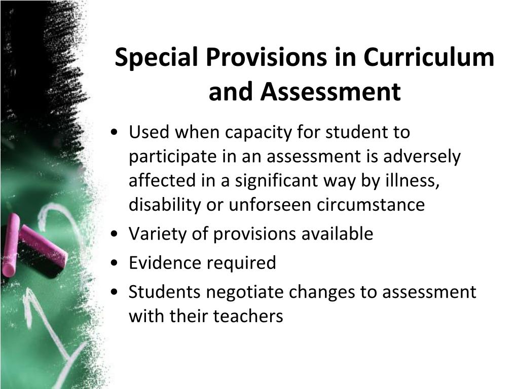 Special Provisions in Curriculum and Assessment • Used when capacity for student to participate in an assessment is adversely affected in a significant way by illness, disability or unforseen circumstance • Variety of provisions available • Evidence required • Students negotiate changes to assessment with their teachers