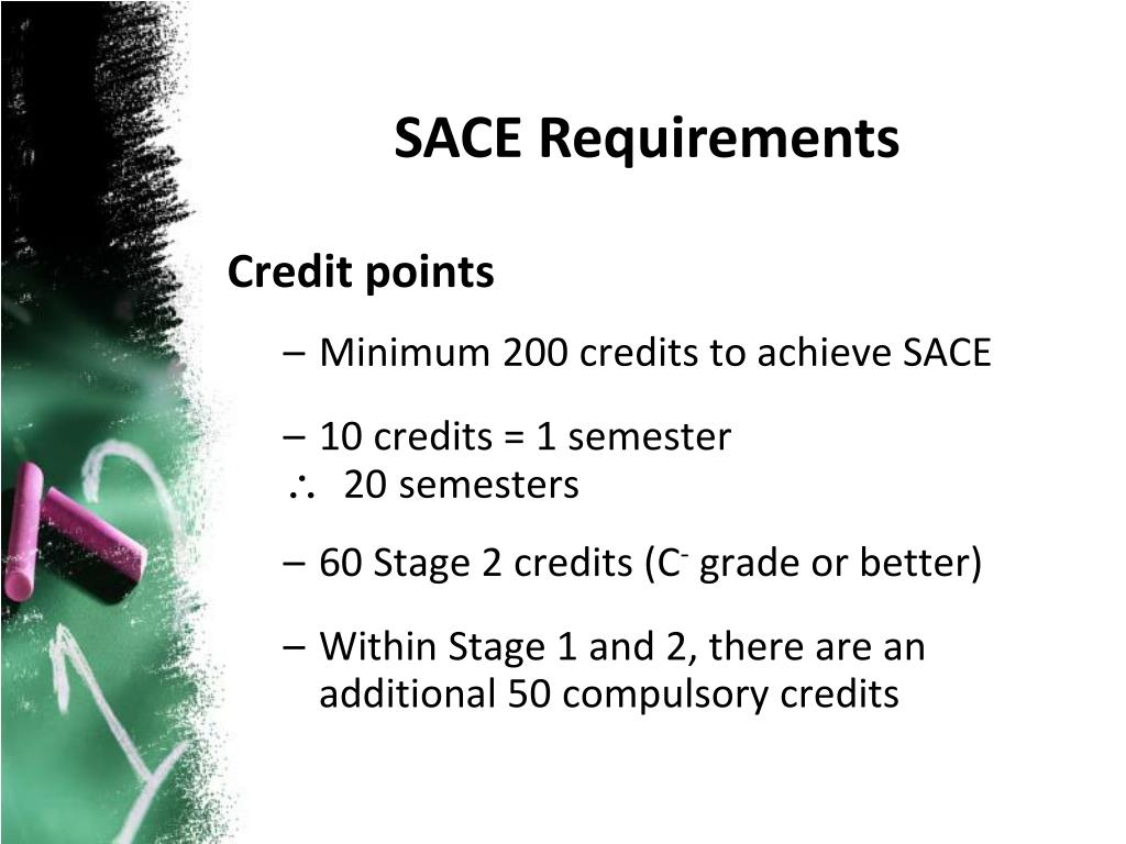 SACE Requirements Credit points • Minimum 200 credits to achieve SACE • 10 credits = 1 semester \ 20semesters • 60 Stage 2 credits (C- grade or better) • Within Stage 1 and 2, there are an additional 50 compulsory credits
