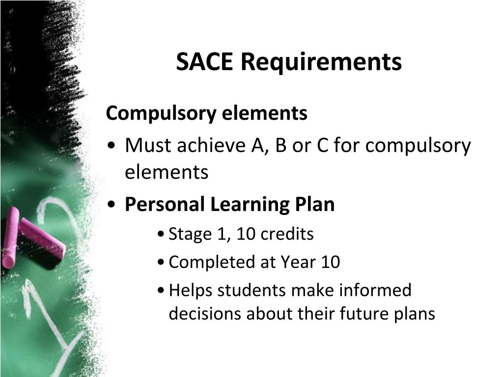 SACE Requirements Compulsory elements • Must achieve A, B or C for compulsory elements • Personal Learning Plan • Stage 1, 10 credits • Completed at Year 10 • Helps students make informed decisions about their future plans