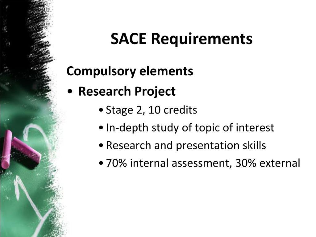 SACE Requirements Compulsory elements • Research Project • Stage 2, 10 credits • In-depth study of topic of interest • Research and presentation skills • 70% internal assessment, 30% external