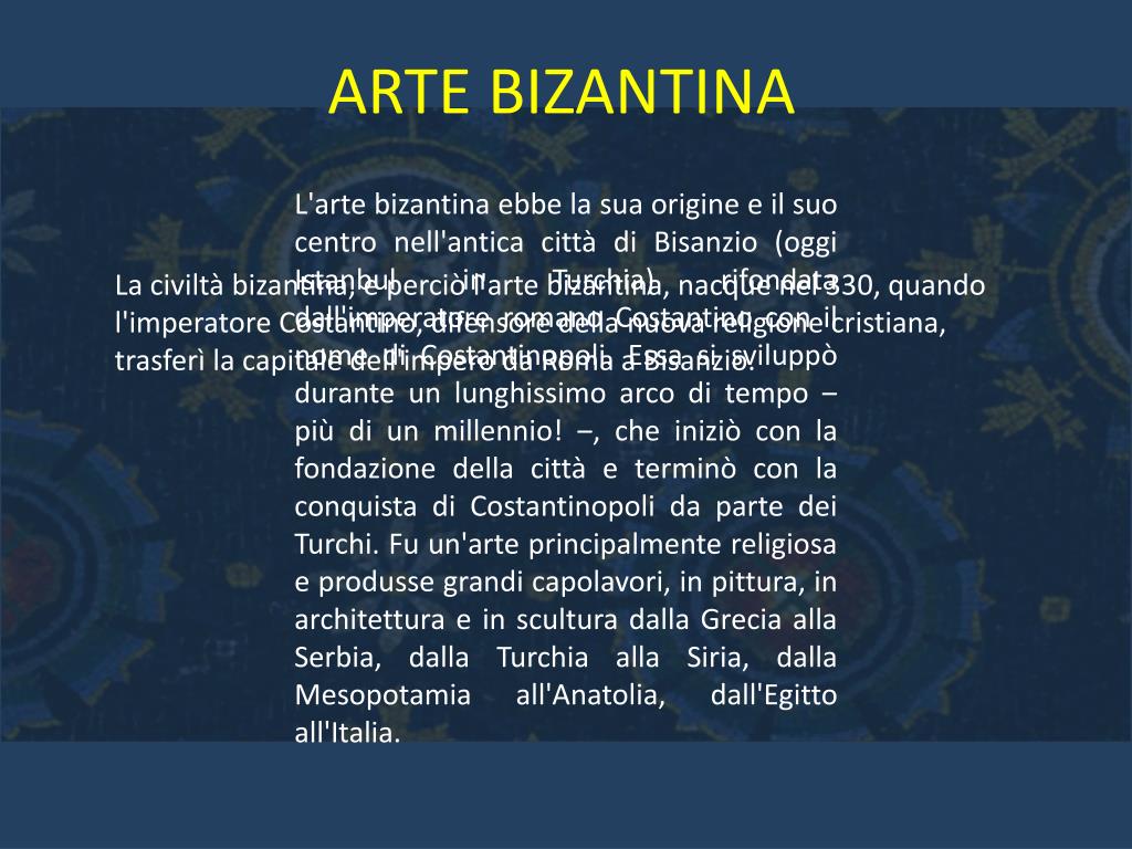 ARTE BIZANTINA L'arte bizantina ebbe la sua origine e il suo centro nell'antica città di Bisanzio (oggi Istanbul in Turchia) rifondata dall'imperatore romano Costantino con il nome di Costantinopoli. Essa si sviluppò durante un lunghissimo arco di tempo ‒ più di un millennio! ‒, che iniziò con la fondazione della città e terminò con la conquista di Costantinopoli da parte dei Turchi. Fu un'arte principalmente religiosa e produsse grandi capolavori, in pittura, in architettura e in scultura dalla Grecia alla Serbia, dalla Turchia alla Siria, dalla Mesopotamia all'Anatolia, dall'Egitto all'Italia. La civiltà bizantina, e perciò l'arte bizantina, nacque nel 330, quando l'imperatore Costantino, difensore della nuova religione cristiana, trasferì la capitale dell'impero da Roma a Bisanzio.
