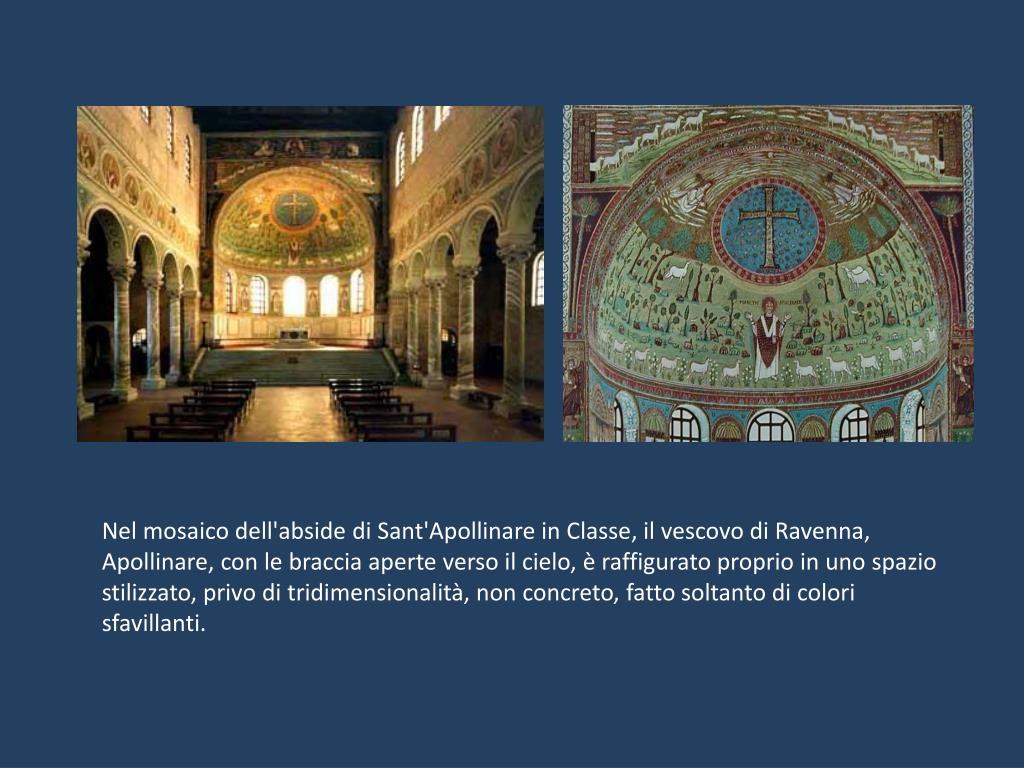 Nel mosaico dell'abside di Sant'Apollinare in Classe, il vescovo di Ravenna, Apollinare, con le braccia aperte verso il cielo, è raffigurato proprio in uno spazio stilizzato, privo di tridimensionalità, non concreto, fatto soltanto di colori sfavillanti.