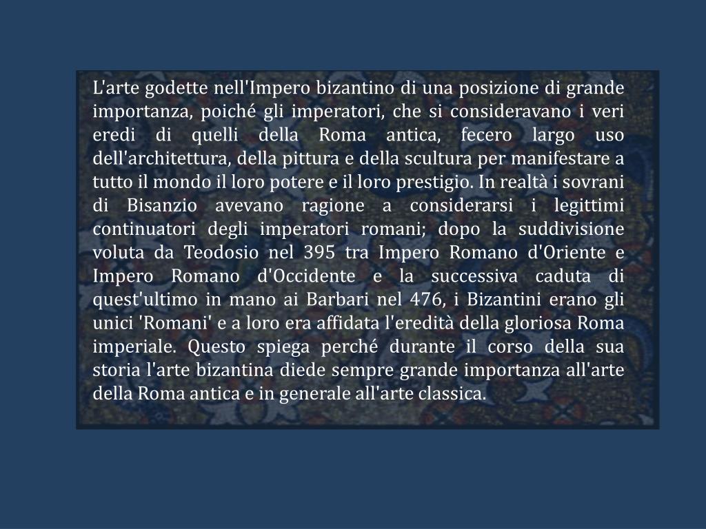 L'arte godette nell'Impero bizantino di una posizione di grande importanza, poiché gli imperatori, che si consideravano i veri eredi di quelli della Roma antica, fecero largo uso dell'architettura, della pittura e della scultura per manifestare a tutto il mondo il loro potere e il loro prestigio. In realtà i sovrani di Bisanzio avevano ragione a considerarsi i legittimi continuatori degli imperatori romani; dopo la suddivisione voluta da Teodosio nel 395 tra Impero Romano d'Oriente e Impero Romano d'Occidente e la successiva caduta di quest'ultimo in mano ai Barbari nel 476, i Bizantini erano gli unici 'Romani' e a loro era affidata l'eredità della gloriosa Roma imperiale. Questo spiega perché durante il corso della sua storia l'arte bizantina diede sempre grande importanza all'arte della Roma antica e in generale all'arte classica.