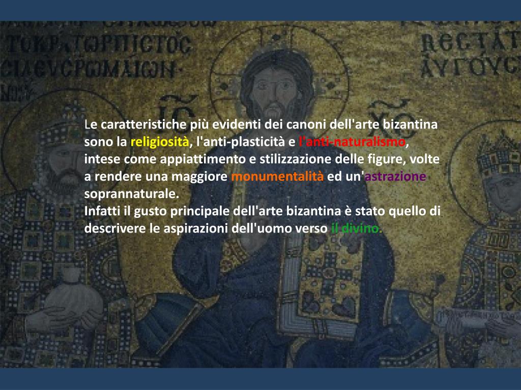 Le caratteristiche più evidenti dei canoni dell'arte bizantina sono la religiosità, l'anti-plasticità e l'anti-naturalismo, intese come appiattimento e stilizzazione delle figure, volte a rendere una maggiore monumentalità ed un'astrazionesoprannaturale. Infatti il gusto principale dell'arte bizantina è stato quello di descrivere le aspirazioni dell'uomo verso il divino.