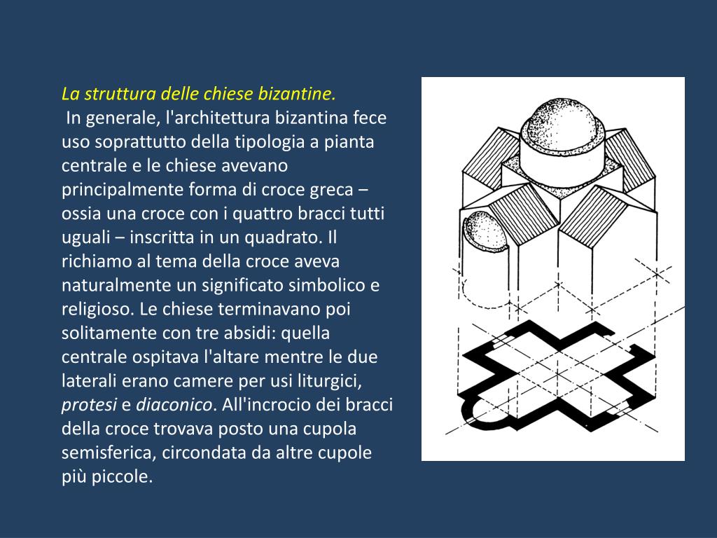La struttura delle chiese bizantine. In generale, l'architettura bizantina fece uso soprattutto della tipologia a pianta centrale e le chiese avevano principalmente forma di croce greca ‒ ossia una croce con i quattro bracci tutti uguali ‒ inscritta in un quadrato. Il richiamo al tema della croce aveva naturalmente un significato simbolico e religioso. Le chiese terminavano poi solitamente con tre absidi: quella centrale ospitava l'altare mentre le due laterali erano camere per usi liturgici, protesi e diaconico. All'incrocio dei bracci della croce trovava posto una cupola semisferica, circondata da altre cupole più piccole.