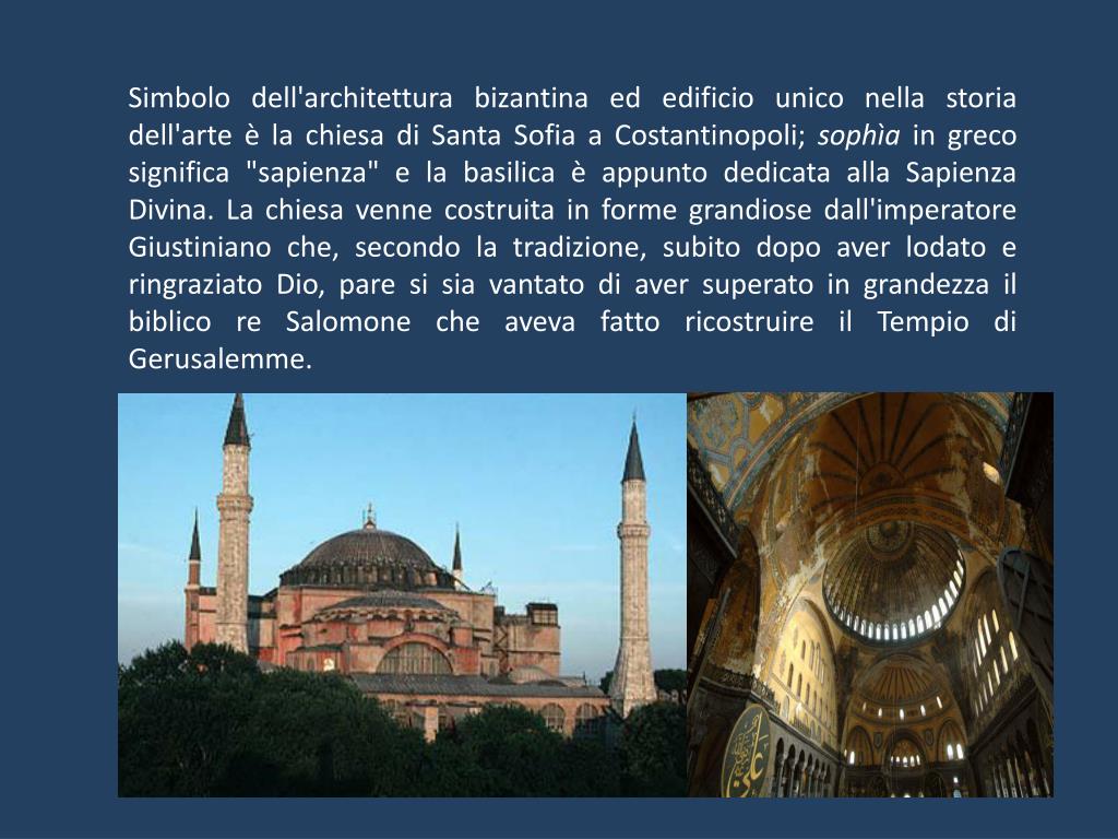 Simbolo dell'architettura bizantina ed edificio unico nella storia dell'arte è la chiesa di Santa Sofia a Costantinopoli; sophìa in greco significa "sapienza" e la basilica è appunto dedicata alla Sapienza Divina. La chiesa venne costruita in forme grandiose dall'imperatore Giustiniano che, secondo la tradizione, subito dopo aver lodato e ringraziato Dio, pare si sia vantato di aver superato in grandezza il biblico re Salomone che aveva fatto ricostruire il Tempio di Gerusalemme.