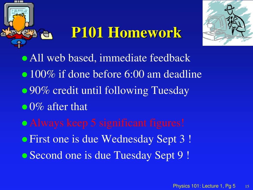 P101 Homework • All web based, immediate feedback • 100% if done before 6:00 am deadline • 90% credit until following Tuesday • 0% after that • Always keep 5 significant figures! • First one is due Wednesday Sept 3 ! • Second one is due Tuesday Sept 9 ! 15