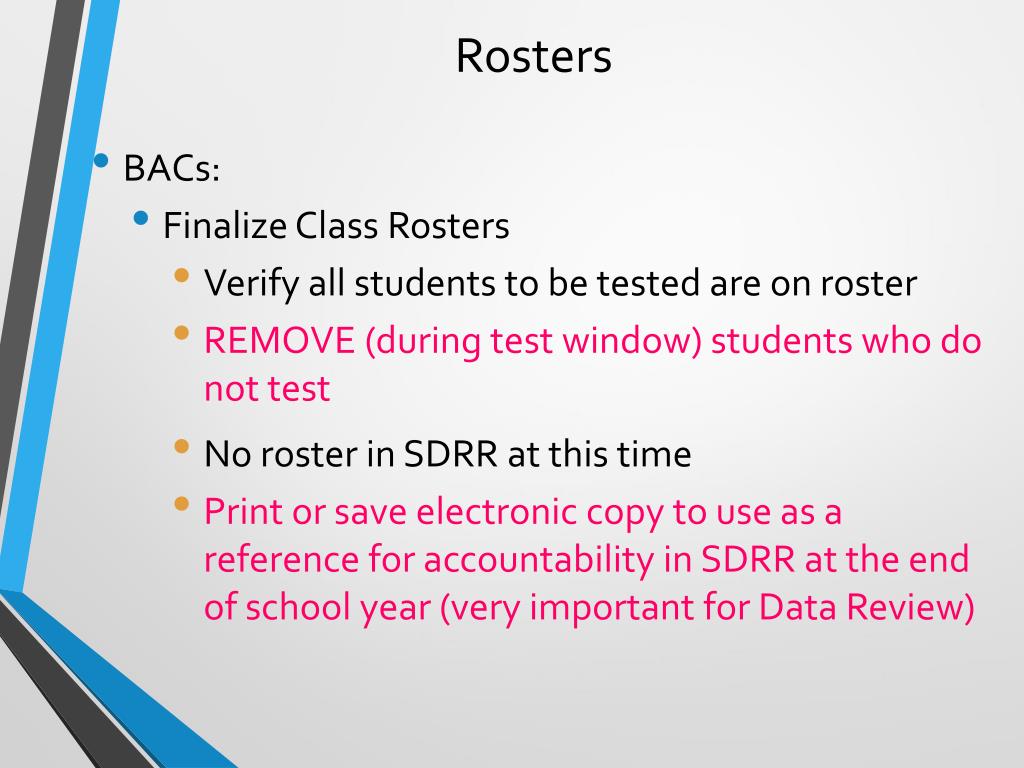 Rosters • BACs: • Finalize Class Rosters • Verify all students to be tested are on roster • REMOVE (during test window) students who do not test • No roster in SDRR at this time • Print or save electronic copy to use as a reference for accountability in SDRR at the end of school year(very important for Data Review)