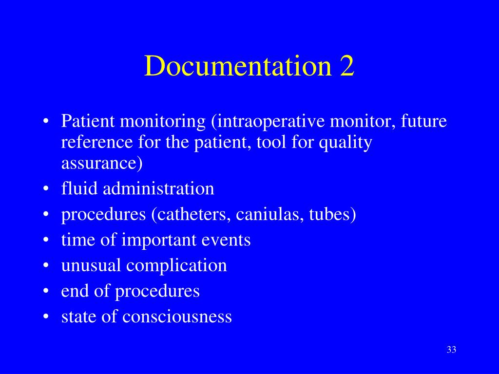 Documentation 2 • Patient monitoring (intraoperative monitor, future reference for the patient, tool for quality assurance) • fluid administration • procedures (catheters, caniulas, tubes) • time of important events • unusual complication • end of procedures • state of consciousness
