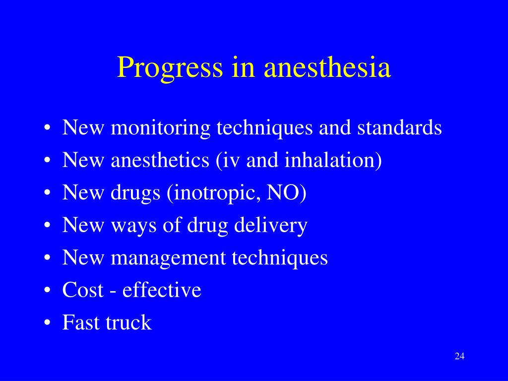 Progress in anesthesia • New monitoring techniques and standards • New anesthetics (iv and inhalation) • New drugs (inotropic, NO) • New ways of drug delivery • New management techniques • Cost - effective • Fast truck