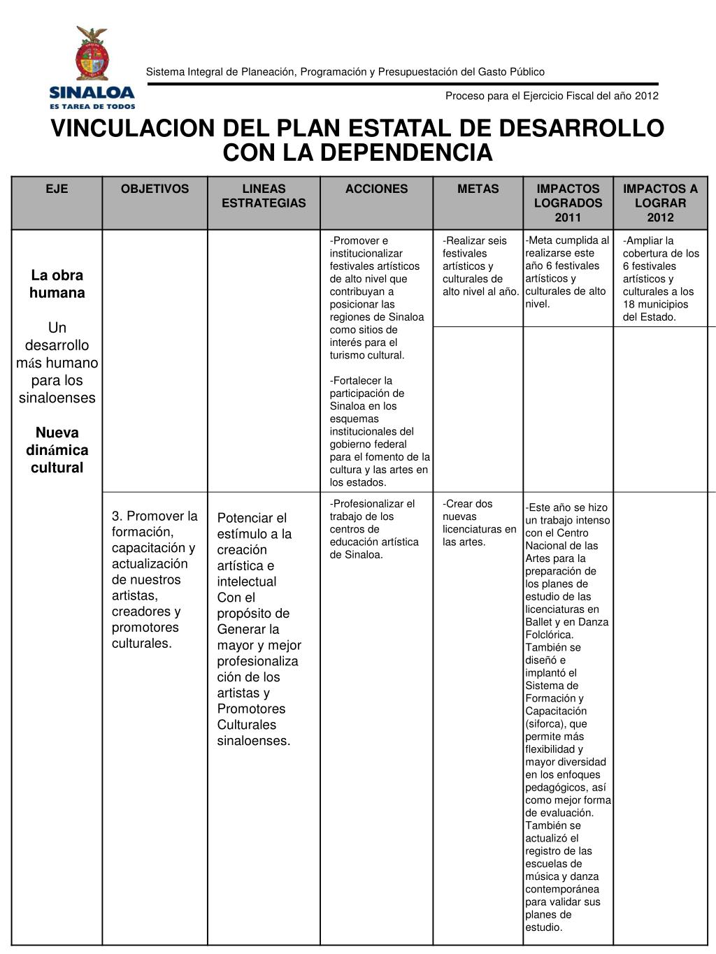 VINCULACION DEL PLAN ESTATAL DE DESARROLLO CON LA DEPENDENCIA -Meta cumplida al realizarse este año 6 festivales artísticos y culturales de alto nivel. -Este año se hizo un trabajo intenso con el Centro Nacional de las Artes para la preparación de los planes de estudio de las licenciaturas en Ballet y en Danza Folclórica. También se diseñó e implantó el Sistema de Formación y Capacitación (siforca), que permite más flexibilidad y mayor diversidad en los enfoques pedagógicos, así como mejor forma de evaluación. También se actualizó el registro de las escuelas de música y danza contemporánea para validar sus planes de estudio. -Promover e institucionalizar festivales artísticos de alto nivel que contribuyan a posicionar las regiones de Sinaloa como sitios de interés para el turismo cultural. -Fortalecer la participación de Sinaloa en los esquemas institucionales del gobierno federal para el fomento de la cultura y las artes en los estados. -Realizar seis festivales artísticos y culturales de alto nivel al año. -Ampliar la cobertura de los 6 festivales artísticos y culturales a los 18 municipios del Estado. La obra humana Un desarrollo más humano para los sinaloenses Nueva dinámica cultural -Profesionalizar el trabajo de los centros de educación artística de Sinaloa. -Crear dos nuevas licenciaturas en las artes. 3. Promover la formación, capacitación y actualización de nuestros artistas, creadores y promotores culturales. Potenciar el estímulo a la creación artística e intelectual Con el propósito de Generar la mayor y mejor profesionalización de los artistas y Promotores Culturales sinaloenses.