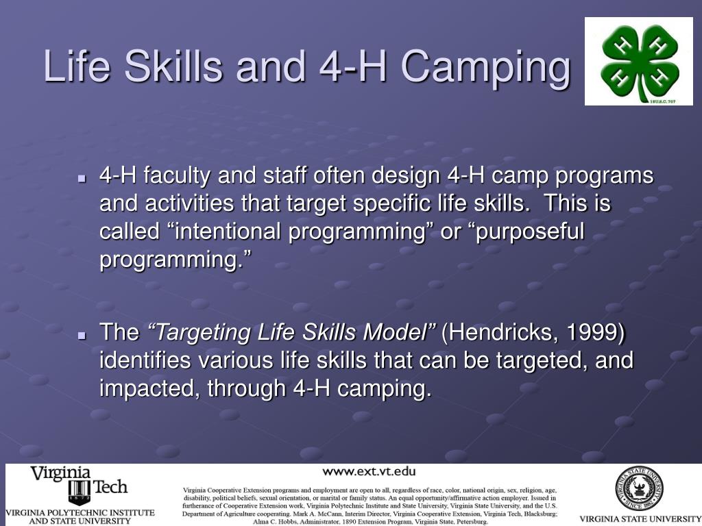 Life Skills and 4-H Camping • 4-H faculty and staff often design 4-H camp programs and activities that target specific life skills. This is called “intentional programming” or “purposeful programming.” • The “Targeting Life Skills Model” (Hendricks, 1999) identifies various life skills that can be targeted, and impacted, through 4-H camping.