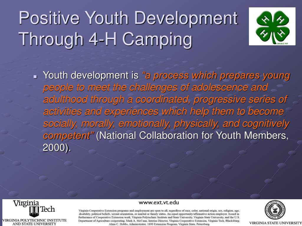 Positive Youth Development Through 4-H Camping • Youth development is “a process which prepares young people to meet the challenges of adolescence and adulthood through a coordinated, progressive series of activities and experiences which help them to become socially, morally, emotionally, physically, and cognitively competent” (National Collaboration for Youth Members, 2000).