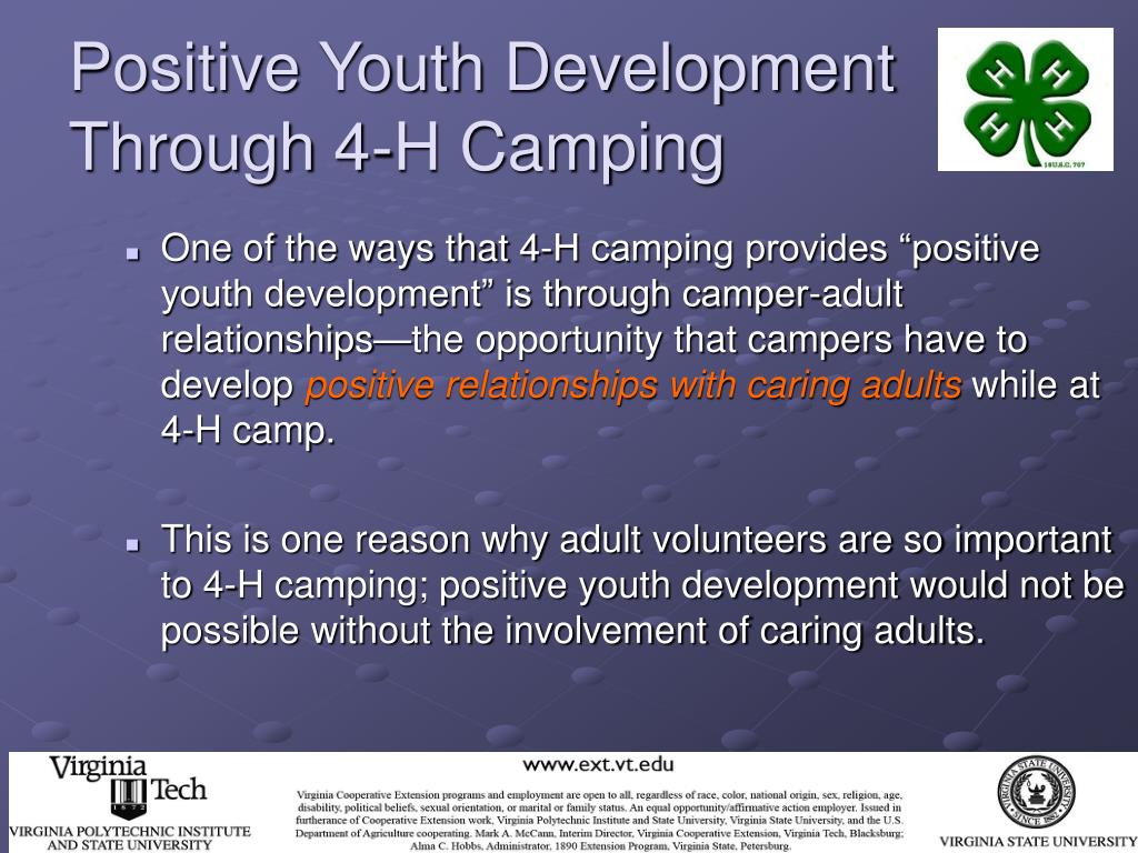 Positive Youth Development Through 4-H Camping • One of the ways that 4-H camping provides “positive youth development” is through camper-adult relationships—the opportunity that campers have to develop positive relationships with caring adults while at 4-H camp. • This is one reason why adult volunteers are so important to 4-H camping; positive youth development would not be possible without the involvement of caring adults.