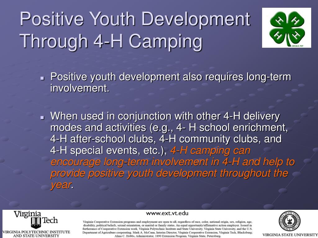 Positive Youth Development Through 4-H Camping • Positive youth development also requires long-term involvement. • When used in conjunction with other 4-H delivery modes and activities (e.g., 4- H school enrichment, 4-H after-school clubs, 4-H community clubs, and 4-H special events, etc.), 4-H camping can encourage long-term involvement in 4-H and help to provide positive youth development throughout the year.