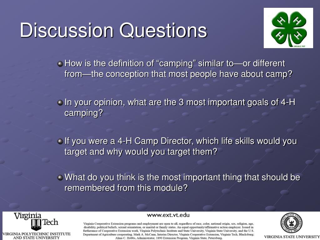 Discussion Questions • How is the definition of “camping” similar to—or different from—the conception that most people have about camp? • In your opinion, what are the 3 most important goals of 4-H camping? • If you were a 4-H Camp Director, which life skills would you target and why would you target them? • What do you think is the most important thing that should be remembered from this module?