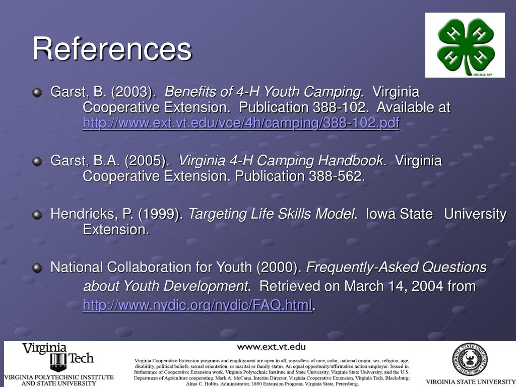 References • Garst, B. (2003). Benefits of 4-H Youth Camping. Virginia Cooperative Extension. Publication 388-102. Available at http://www.ext.vt.edu/vce/4h/camping/388-102.pdf • Garst, B.A. (2005). Virginia 4-H Camping Handbook. Virginia Cooperative Extension. Publication 388-562. • Hendricks, P. (1999). Targeting Life Skills Model. Iowa State University Extension. • National Collaboration for Youth (2000). Frequently-Asked Questions about Youth Development. Retrieved on March 14, 2004 from http://www.nydic.org/nydic/FAQ.html.