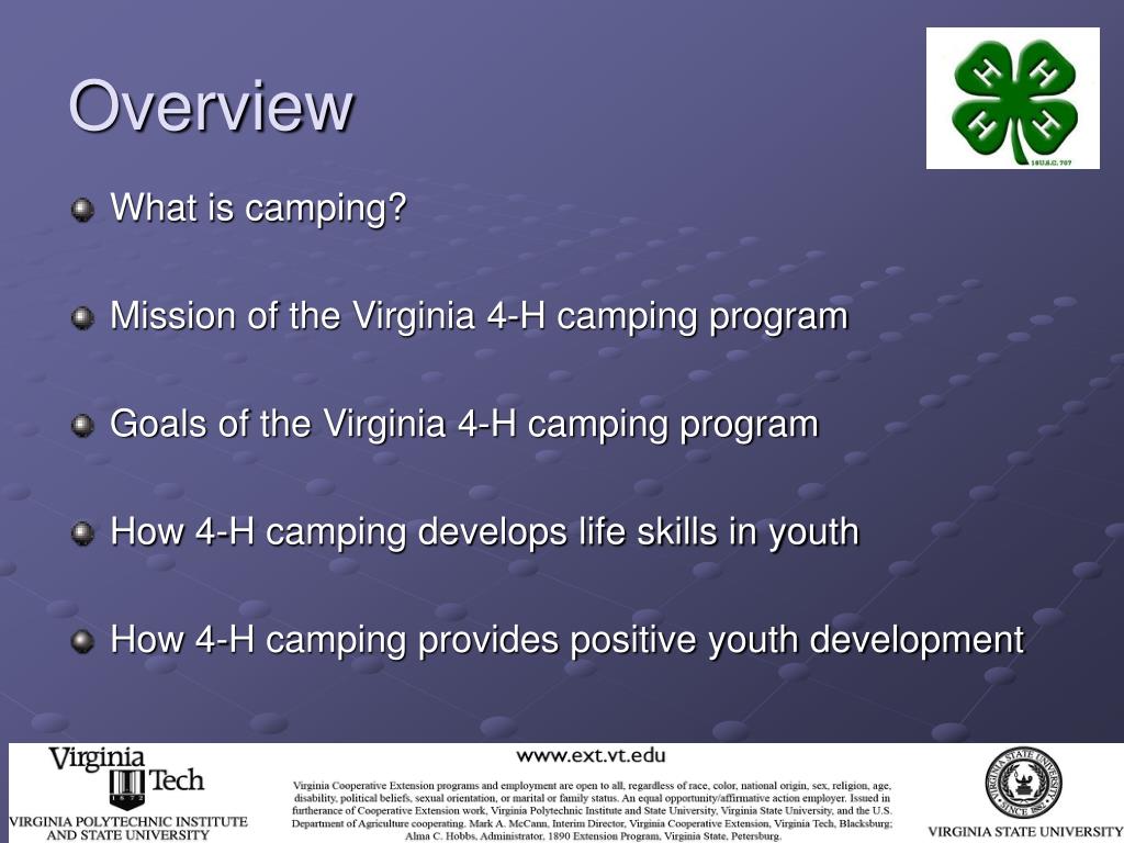Overview • What is camping? • Mission of the Virginia 4-H camping program • Goals of the Virginia 4-H camping program • How 4-H camping develops life skills in youth • How 4-H camping provides positive youth development