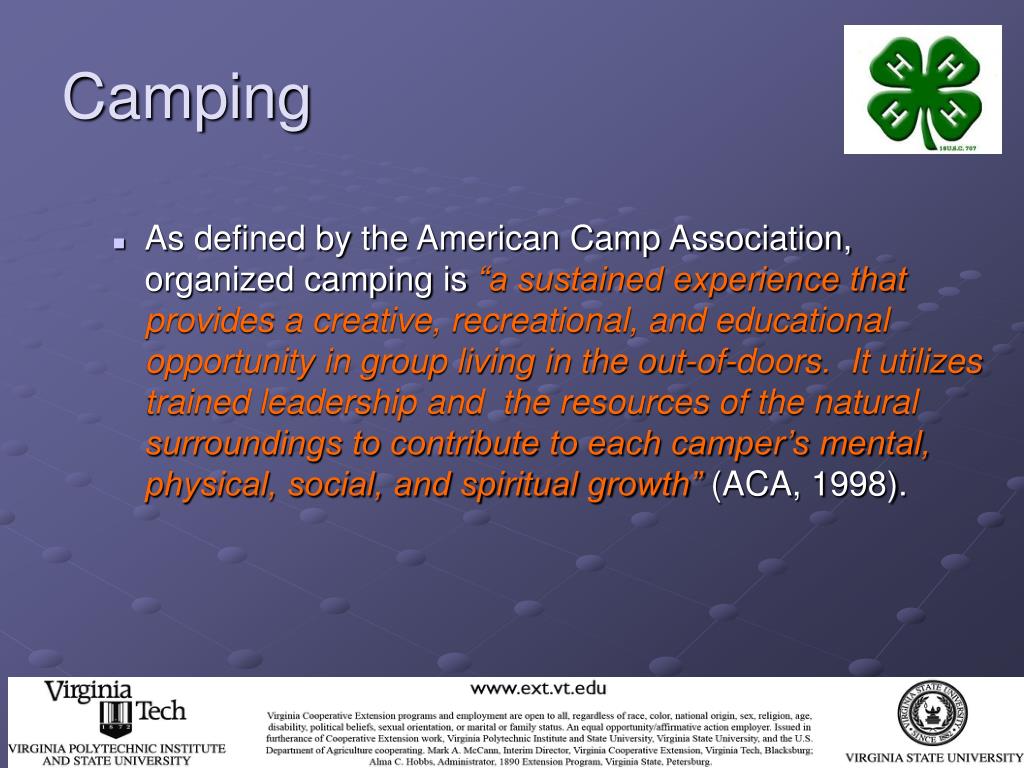 Camping • As defined by the American Camp Association, organized camping is “a sustained experience that provides a creative, recreational, and educational opportunity in group living in the out-of-doors. It utilizes trained leadership and the resources of the natural surroundings to contribute to each camper’s mental, physical, social, and spiritual growth” (ACA, 1998).