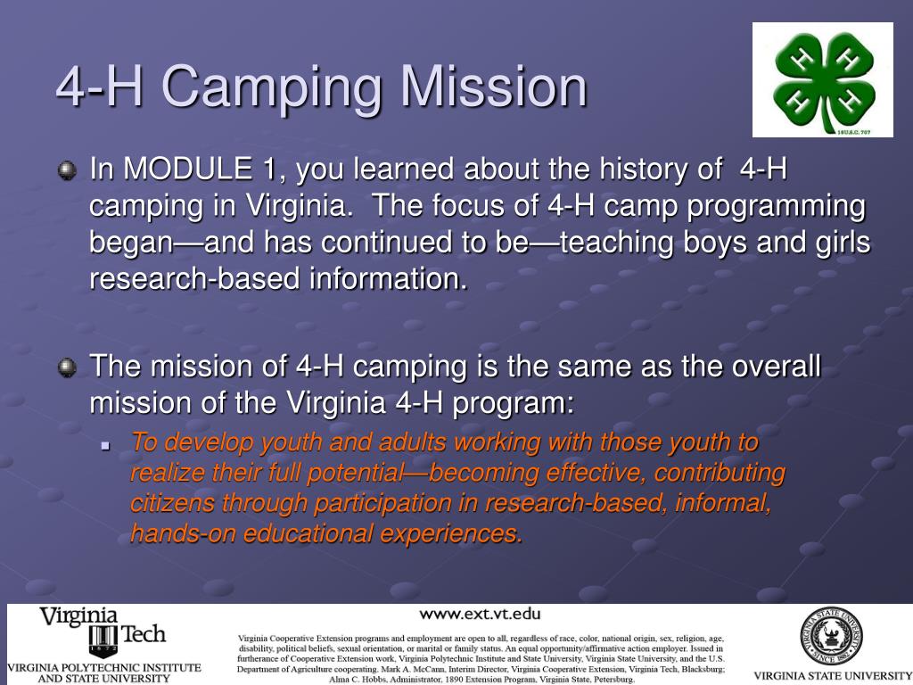 4-H Camping Mission • In MODULE 1, you learned about the history of 4-H camping in Virginia. The focus of 4-H camp programming began—and has continued to be—teaching boys and girls research-based information. • The mission of 4-H camping is the same as the overall mission of the Virginia 4-H program: • To develop youth and adults working with those youth to realize their full potential—becoming effective, contributing citizens through participation in research-based, informal, hands-on educational experiences.