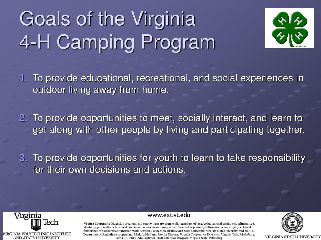 Goals of the Virginia 4-H Camping Program • To provide educational, recreational, and social experiences in outdoor living away from home. • To provide opportunities to meet, socially interact, and learn to get along with other people by living and participating together. • To provide opportunities for youth to learn to take responsibility for their own decisions and actions.
