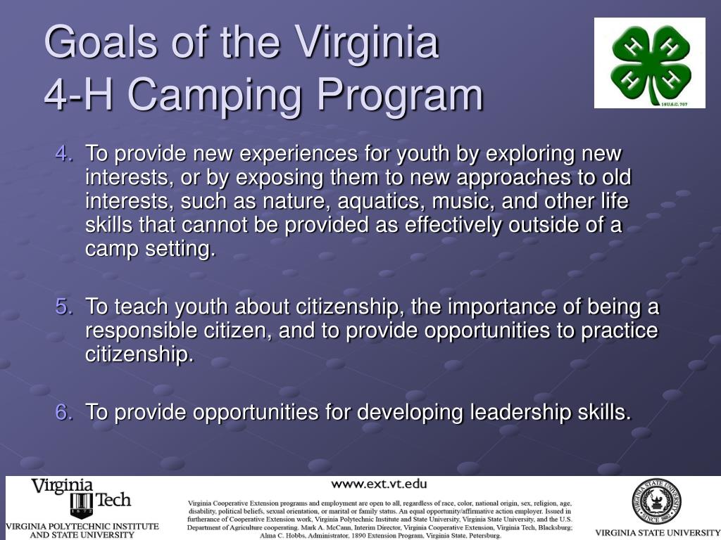 Goals of the Virginia 4-H Camping Program • To provide new experiences for youth by exploring new interests, or by exposing them to new approaches to old interests, such as nature, aquatics, music, and other life skills that cannot be provided as effectively outside of a camp setting. • To teach youth about citizenship, the importance of being a responsible citizen, and to provide opportunities to practice citizenship. • To provide opportunities for developing leadership skills.