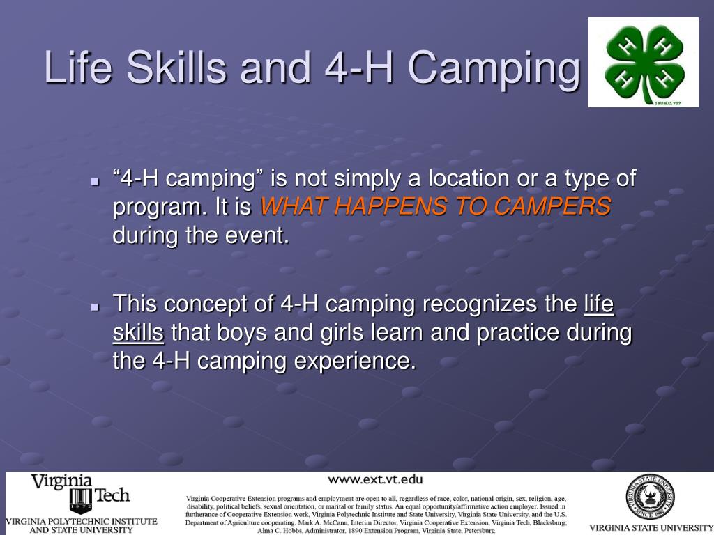 Life Skills and 4-H Camping • “4-H camping” is not simply a location or a type of program. It is WHAT HAPPENS TO CAMPERS during the event. • This concept of 4-H camping recognizes the life skills that boys and girls learn and practice during the 4-H camping experience.