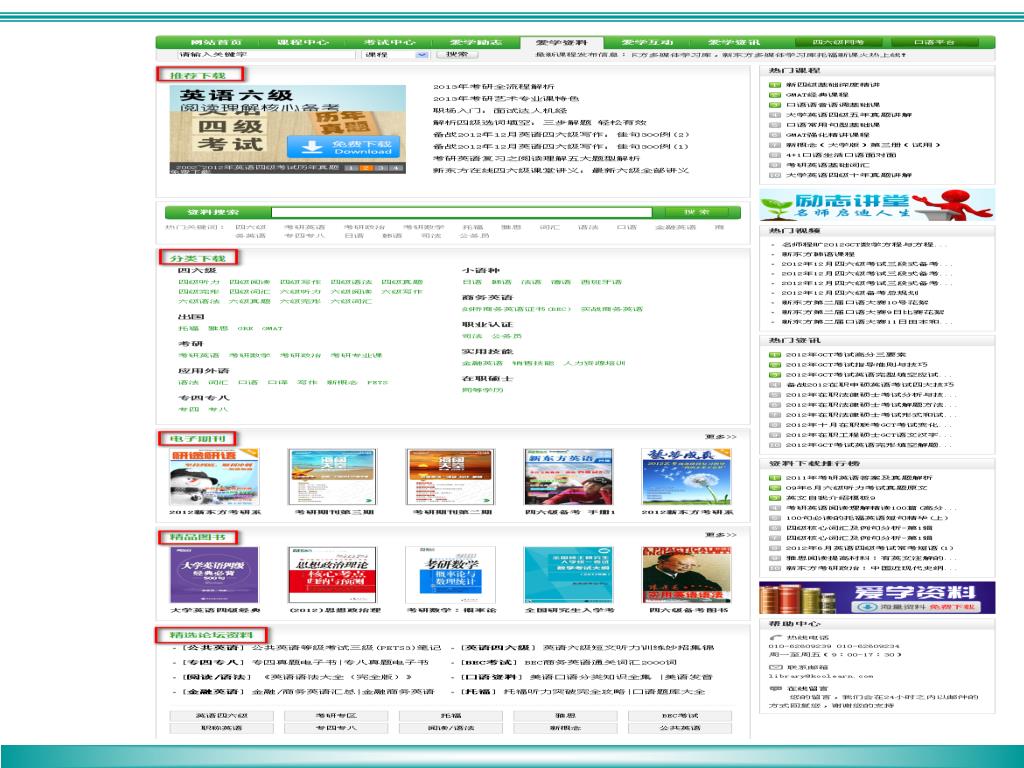 新东方英语:学习资料下载 一、爱学资料栏目简介 推荐下载:最新、最热、最全资料推荐下载。 分类下载:国内应试,出国留学,应用外语,实用技能,商务英语等海量复习资料汇总并支持免费下载。 电子期刊:以flash为主要载体独立于网站存在,且融入了图像,文字,声音、视频、游戏等相互动态结合来呈现给读者,是一种很享受的阅读方式。杂志内容集考试、休闲生活于一体,偏向“学中有乐、乐中有学”的风格,是学生学习生活中不可或缺的调味剂。 精品图书:各考试科目经典、热销图书推荐。 精选论坛资料:各类新鲜资料大杂烩 页面示意图如下
