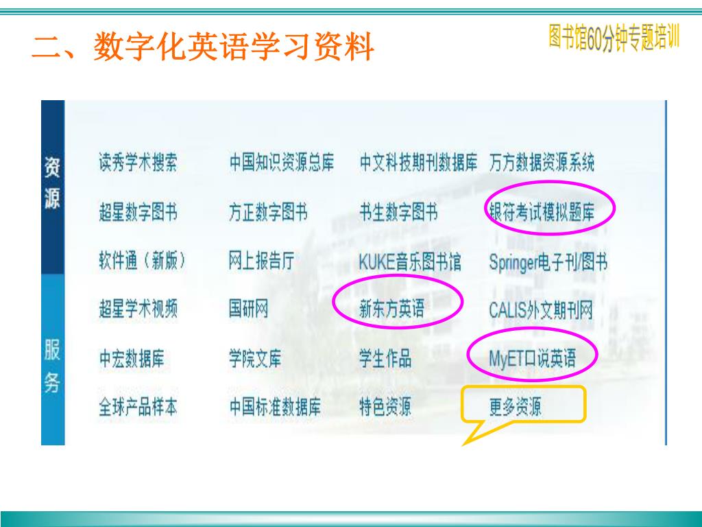 口说型——MyET 图书馆英语学习数字资源 试题型——银符 视频教程型——新东方