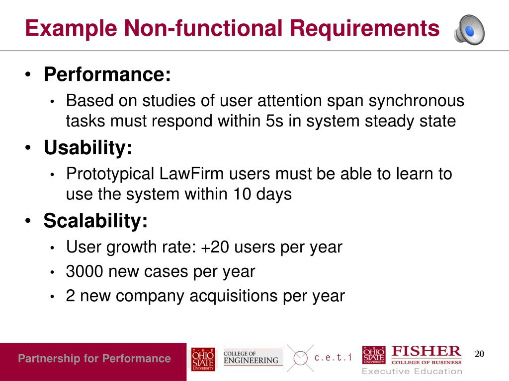 Example Non-functional Requirements • Performance: • Based on studies of user attention span synchronous tasks must respond within 5s in system steady state • Usability: • Prototypical LawFirm users must be able to learn to use the system within 10 days • Scalability: • User growth rate: +20 users per year • 3000 new cases per year • 2 new company acquisitions per year Partnership for Performance