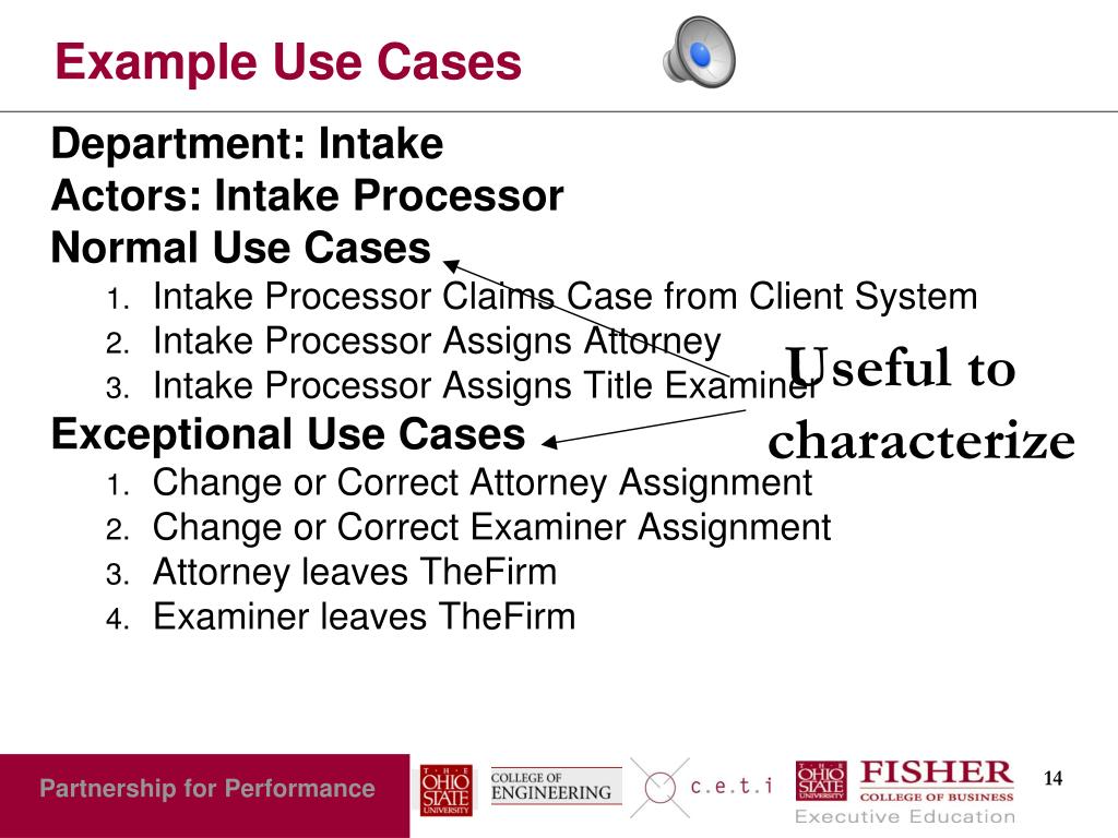 Example Use Cases • Department: Intake • Actors: Intake Processor • Normal Use Cases • Intake Processor Claims Case from Client System • Intake Processor Assigns Attorney • Intake Processor Assigns Title Examiner • Exceptional Use Cases • Change or Correct Attorney Assignment • Change or Correct Examiner Assignment • Attorney leaves TheFirm • Examiner leaves TheFirm Useful to characterize Partnership for Performance