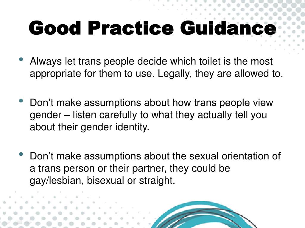 Good Practice Guidance • Always let trans people decide which toilet is the most appropriate for them to use. Legally, they are allowed to. • Don’t make assumptions about how trans people view gender – listen carefully to what they actually tell you about their gender identity. • Don’t make assumptions about the sexual orientation of a trans person or their partner, they could be gay/lesbian, bisexual or straight.