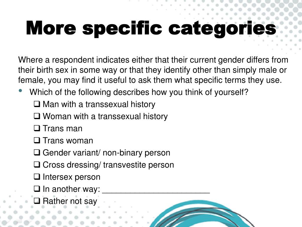 More specific categories Where a respondent indicates either that their current gender differs from their birth sex in some way or that they identify other than simply male or female, you may find it useful to ask them what specific terms they use. • Which of the following describes how you think of yourself? • Man with a transsexual history • Woman with a transsexual history • Trans man • Trans woman • Gender variant/ non-binary person • Cross dressing/ transvestite person • Intersex person • In another way: _______________________ • Rather not say