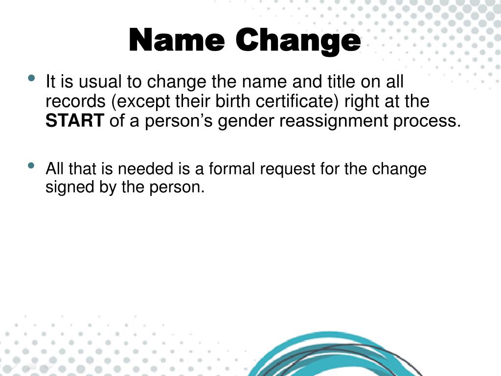 Name Change It is usual to change the name and title on all records (except their birth certificate) right at the START of a person’s gender reassignment process. All that is needed is a formal request for the change signed by the person.