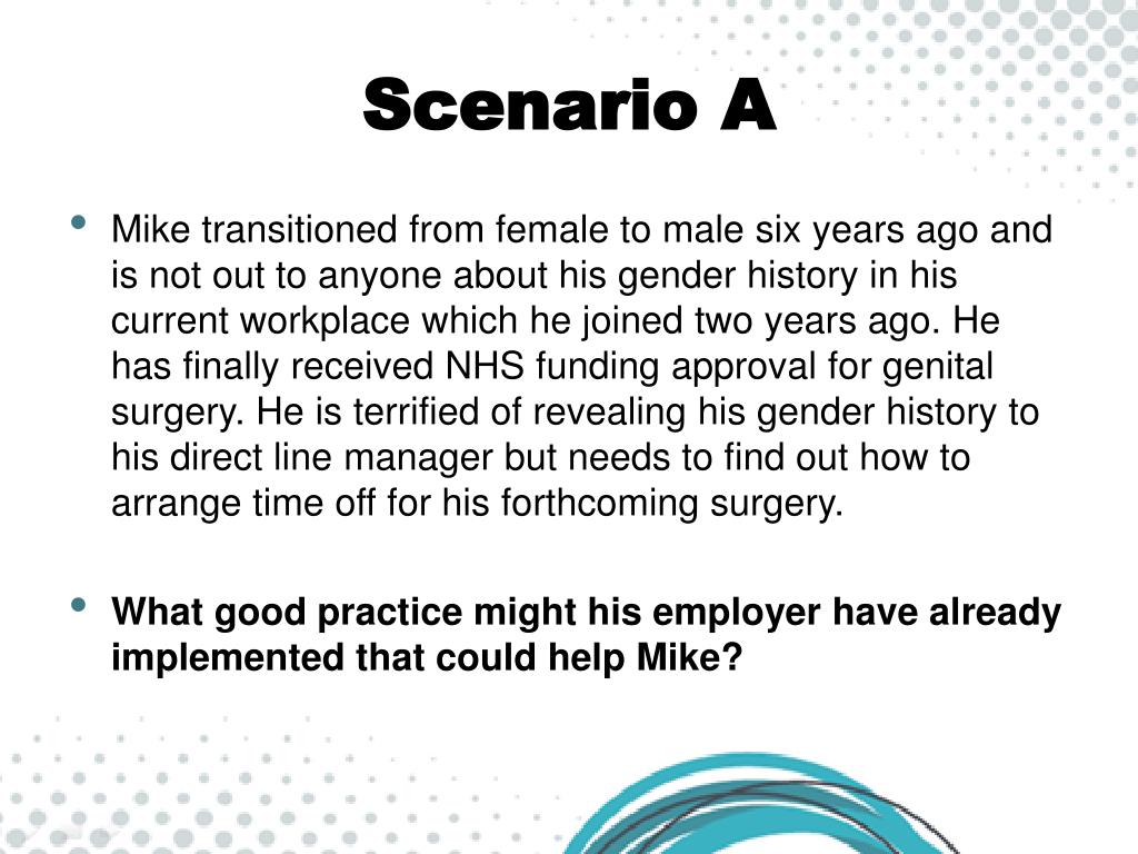 Scenario A • Mike transitioned from female to male six years ago and is not out to anyone about his gender history in his current workplace which he joined two years ago. He has finally received NHS funding approval for genital surgery. He is terrified of revealing his gender history to his direct line manager but needs to find out how to arrange time off for his forthcoming surgery. • What good practice might his employer have already implemented that could help Mike?