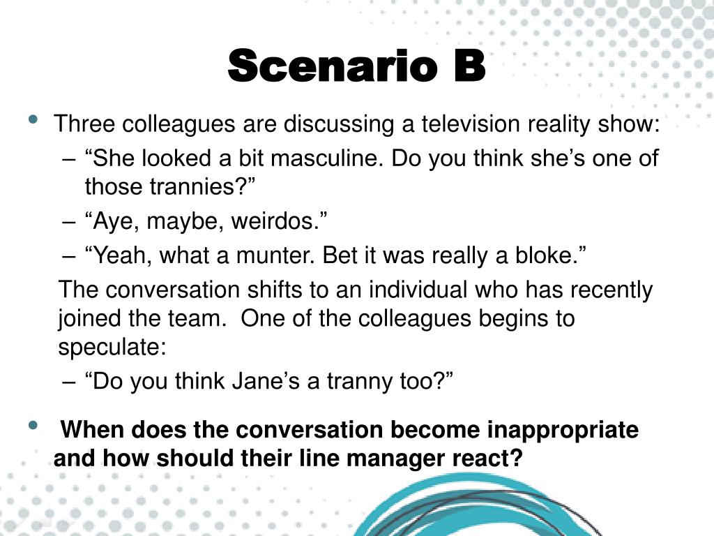 Scenario B • Three colleagues are discussing a television reality show: • “She looked a bit masculine. Do you think she’s one of those trannies?” • “Aye, maybe, weirdos.” • “Yeah, what a munter. Bet it was really a bloke.” The conversation shifts to an individual who has recently joined the team. One of the colleagues begins to speculate: • “Do you think Jane’s a tranny too?” • When does the conversation become inappropriate and how should their line manager react?