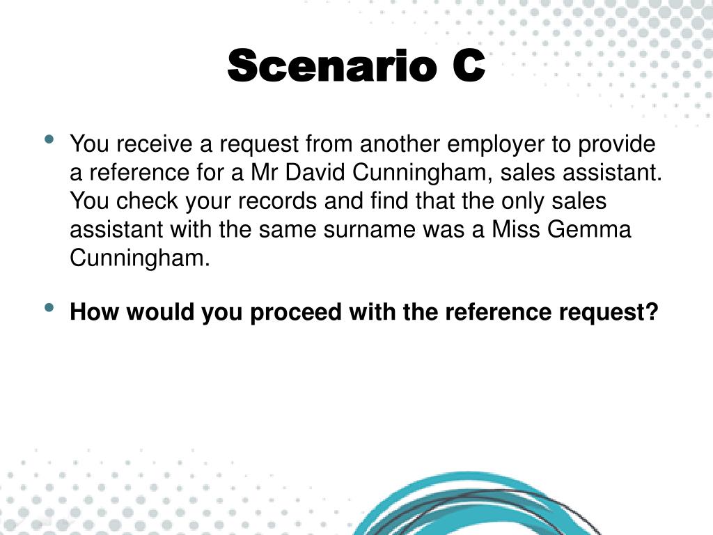 Scenario C • You receive a request from another employer to provide a reference for a Mr David Cunningham, sales assistant. You check your records and find that the only sales assistant with the same surname was a Miss Gemma Cunningham. • How would you proceed with the reference request?