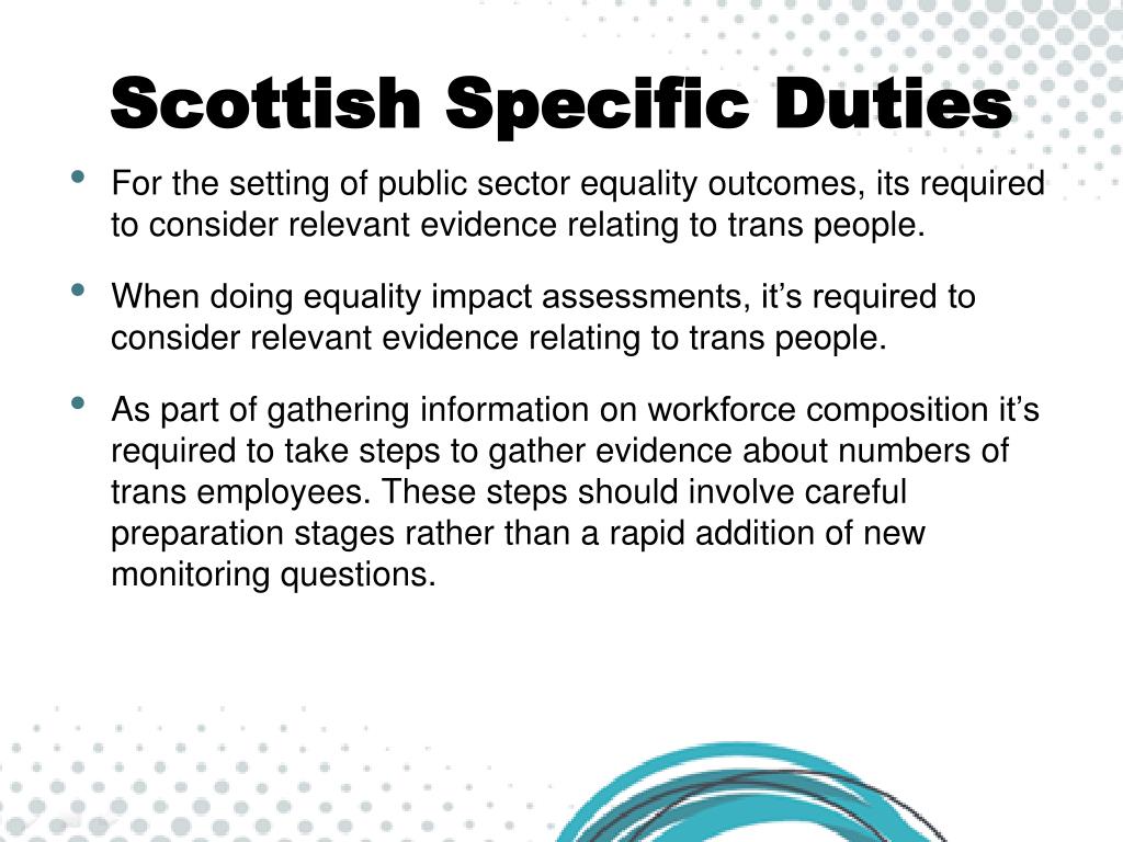Scottish Specific Duties • For the setting of public sector equality outcomes, its required to consider relevant evidence relating to trans people. • When doing equality impact assessments, it’s required to consider relevant evidence relating to trans people. • As part of gathering information on workforce composition it’s required to take steps to gather evidence about numbers of trans employees. These steps should involve careful preparation stages rather than a rapid addition of new monitoring questions.