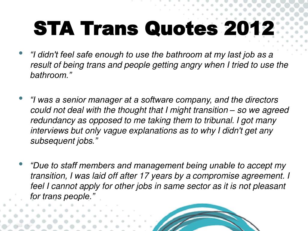 STA Trans Quotes 2012 • “I didn't feel safe enough to use the bathroom at my last job as a result of being trans and people getting angry when I tried to use the bathroom.” • “I was a senior manager at a software company, and the directors could not deal with the thought that I might transition – so we agreed redundancy as opposed to me taking them to tribunal. I got many interviews but only vague explanations as to why I didn't get any subsequent jobs.” • “Due to staff members and management being unable to accept my transition, I was laid off after 17 years by a compromise agreement. I feel I cannot apply for other jobs in same sector as it is not pleasant for trans people.”