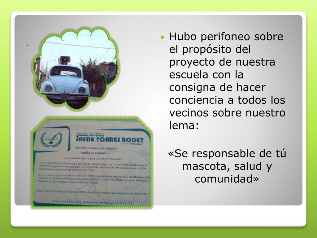 . • Hubo perifoneo sobre el propósito del proyecto de nuestra escuela con la consigna de hacer conciencia a todos los vecinos sobre nuestro lema: «Se responsable de tú mascota, salud y comunidad»