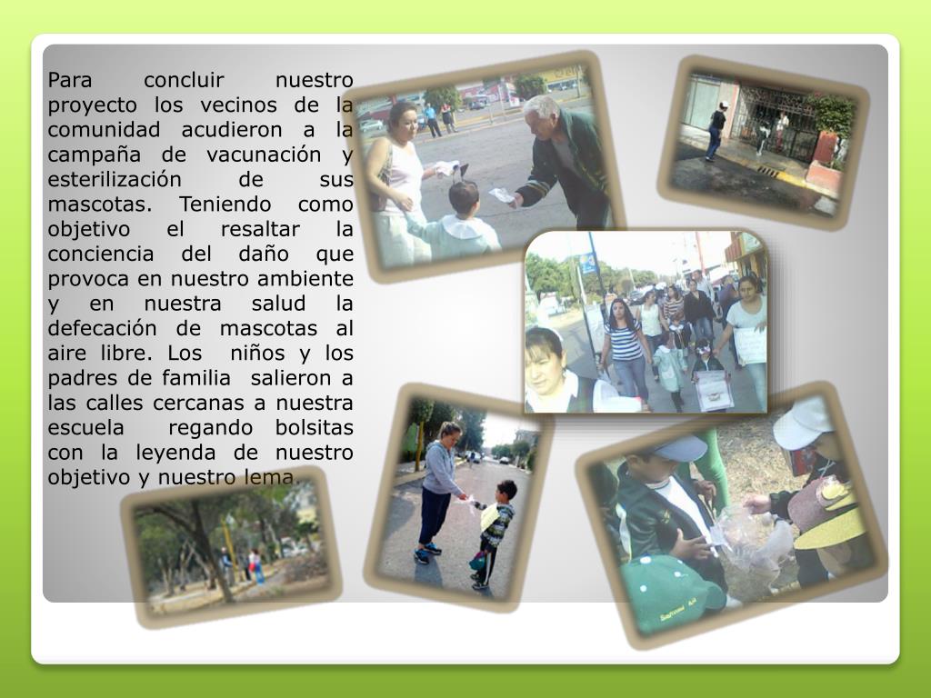 Para concluir nuestro proyecto los vecinos de la comunidad acudieron a la campaña de vacunación y esterilización de sus mascotas. Teniendo como objetivo el resaltar la conciencia del daño que provoca en nuestro ambiente y en nuestra salud la defecación de mascotas al aire libre. Los niños y los padres de familia salieron a las calles cercanas a nuestra escuela regando bolsitas con la leyenda de nuestro objetivo y nuestro lema.