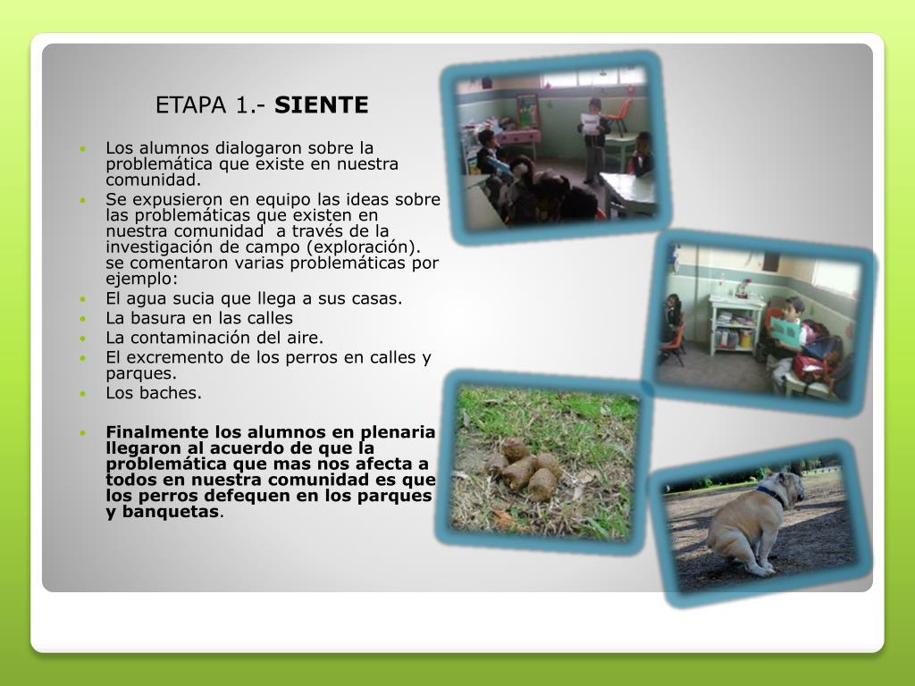 ETAPA 1.- SIENTE • Los alumnos dialogaron sobre la problemática que existe en nuestra comunidad. • Se expusieron en equipo las ideas sobre las problemáticas que existen en nuestra comunidad a través de la investigación de campo (exploración). se comentaron varias problemáticas por ejemplo: • El agua sucia que llega a sus casas. • La basura en las calles • La contaminación del aire. • El excremento de los perros en calles y parques. • Los baches. • Finalmente los alumnos en plenaria llegaron al acuerdo de que la problemática que mas nos afecta a todos en nuestra comunidad es que los perros defequen en los parques y banquetas.
